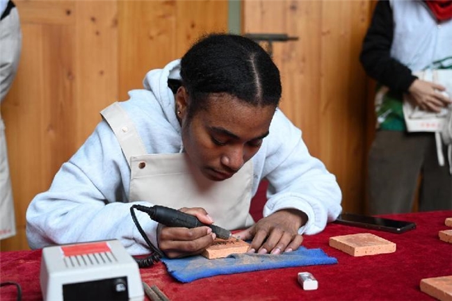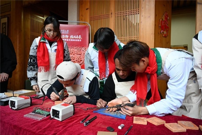 为推动文化创新创造传承,实践队开设红砖雕刻体验台,配备齐全工具、激光设备及装裱材料,由宝玉石鉴定与加工专业主任潘凤副教授全程提供专业讲解,配合实践队成员的细致指导和示范,鼓励体验者结合自身喜好,融入闽南文化元素与个人情感,打造专属作品。留学生们纷纷表示,雕刻体验深刻感受了中国传统技艺和红砖文化特色,亲手制作的摆件承载着对中国文化的喜爱与对新春的美好期盼。