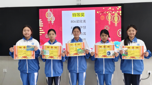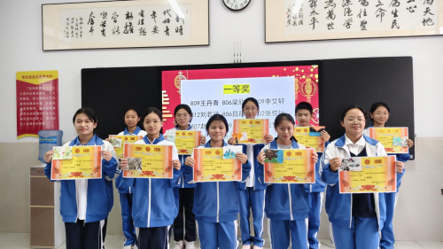 作品征集结束后,八年级语文组与美术组教师吴翊君、年级领导胡丽霞组成评审团,从“意境契合度”“创意美感”“原创诚意”三个方面进行细致评选,最终确定了获奖名单:特等奖5名、一等奖10名、二等奖12名。颁奖典礼上,校领导为获奖学生颁发荣誉证书与文创奖品,对他们“让古诗文活在方寸之间”的创新实践给予肯定。