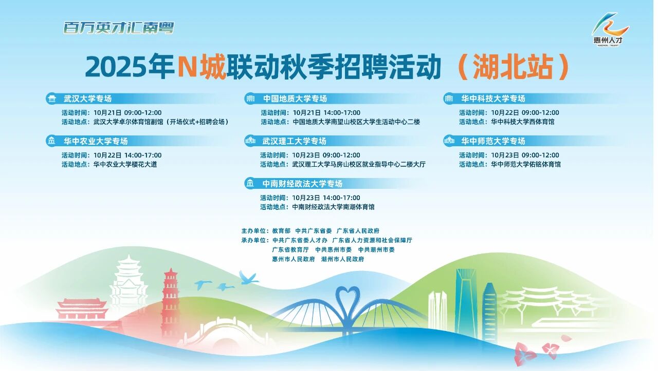 为深入推进 “百万英才汇南粤” 行动计划,夯实广东现代化产业体系人才基座、底座,广东惠州、潮州将于10月21日至23日组织全省企事业单位走进湖北的武汉大学、中国地质大学、华中科技大学、华中农业大学、武汉理工大学、中南财经政法大学、华中师范大学,10月29日至30日走进河南的郑州大学、河南大学共9所高校。