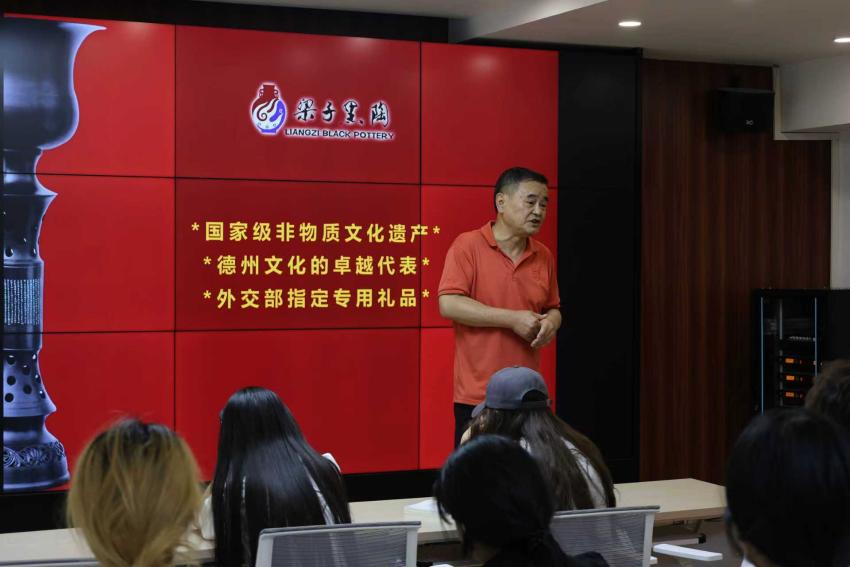课堂上,国家级非遗德州黑陶传承人首先为同学们带来专题分享,系统介绍了德州黑陶作为大运河文化带重要文化符号的历史脉络,讲解了其作为国家级非物质文化遗产、外交部指定专用礼品的文化价值与工艺特色,深入阐释了 “匠心砺陶” 项目破解黑陶传承断层、形式老旧、品牌薄弱等痛点的实践路径。