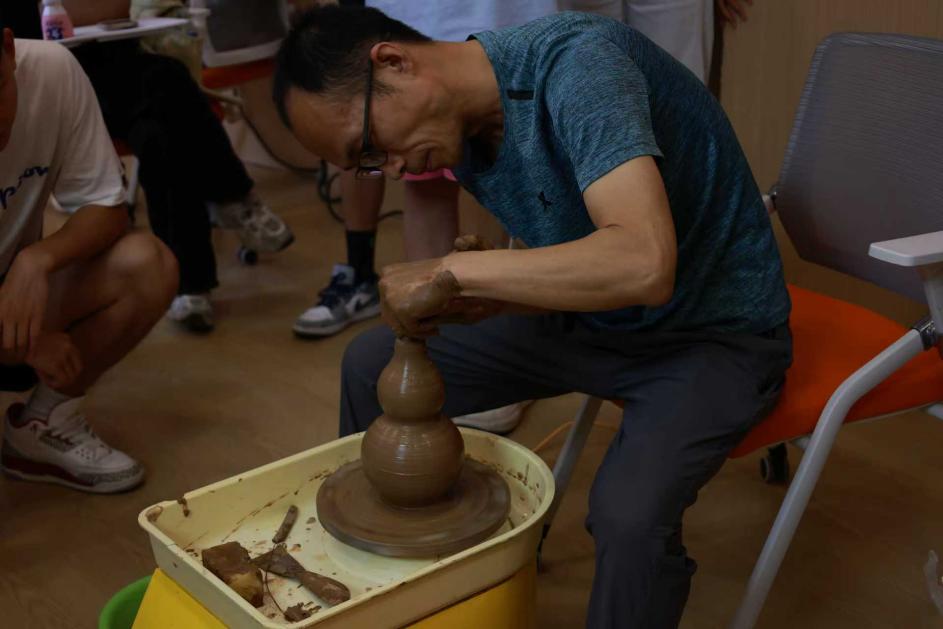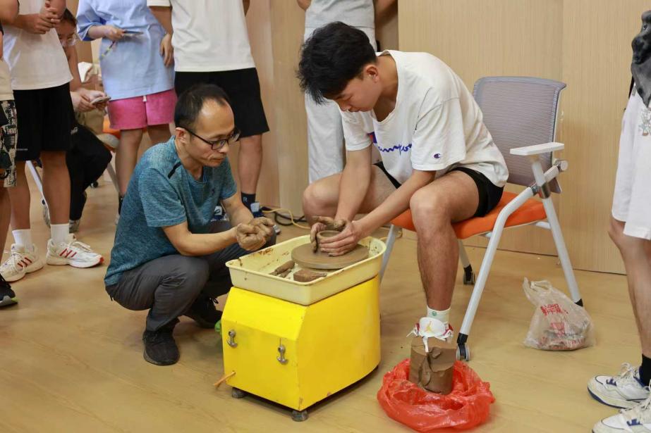 随后,传承人现场演示手工轮制技艺,拉坯、塑形一气呵成,将泥土化为灵动的器型,引得现场师生阵阵赞叹。