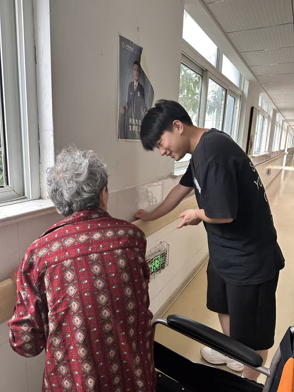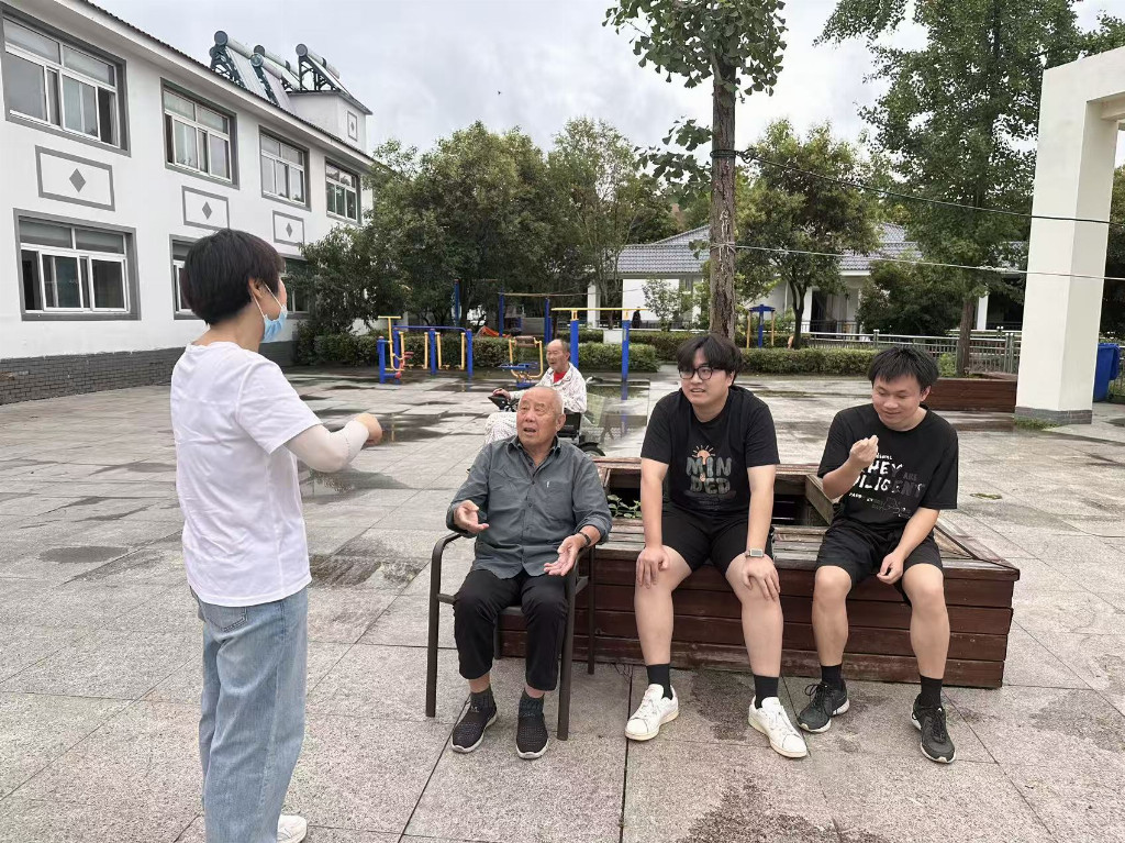 除了趣味对弈,陪老人唠家常是实践队每日的“必修课”。在庭院的长椅上,队员中仲茹正听76岁的李奶奶讲年轻时种稻子的故事,时不时接一句“奶奶您那时候真厉害”;队员小邱则坐在轮椅旁,帮90岁的王爷爷整理衣角,听他回忆当兵时的峥嵘岁月。“这些孩子愿意听我念叨老事儿,比家里晚辈还耐心。”王爷爷攥着小邱的手,眼角的皱纹里浸着笑意。实践队还主动承担起细碎的服务:帮老人擦拭轮椅扶手、整理晾晒的衣物、清扫庭院角落,不起眼的小事里,藏着青春的细致与真诚。